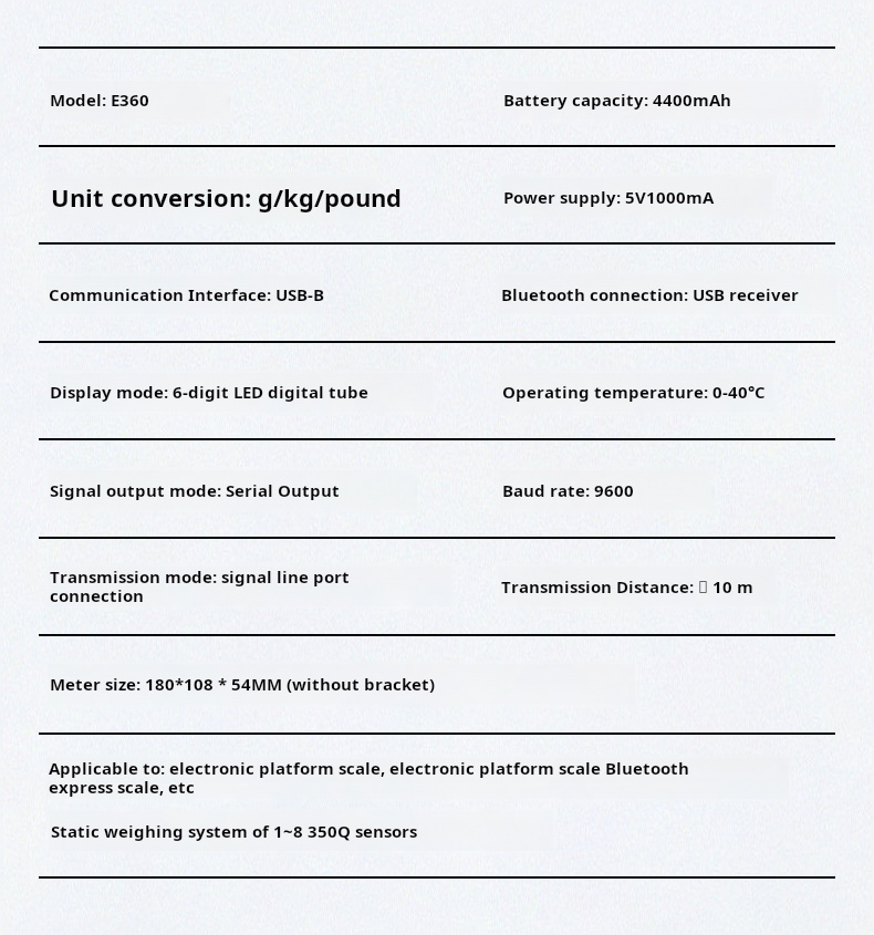 1 Meter head (including power line): it is equipped with English version E360 high-precision meter head, which has been tested for a long time, good quality and durability! Livestock for specific meter, in order to weigh livestock when reading stability. Others are consistent.2 Sensor: 4 sensors for wide measurement, used for a scale surface, famous brand, reliable quality!